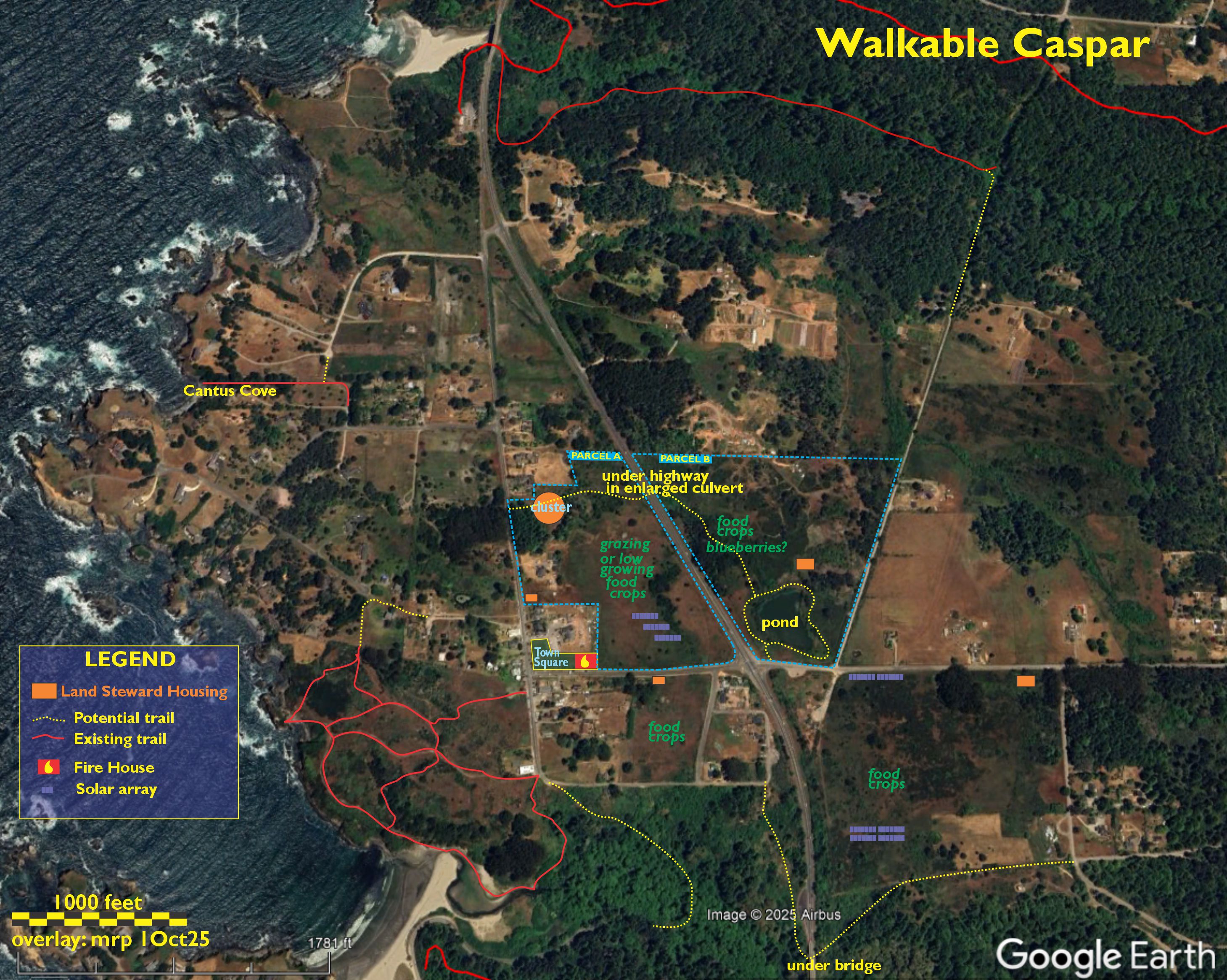 On each of the large open parcels (marked on the map above 'food crops' -- see opposite) a reasonably sized land steward's house, possibly with a barn below for equipment and animals in winter would make the land safer – an unattended pond being an attractive nuisance, for example – while making it possible to restore agriculture to Caspar. Land Trusts, and the Coastal Conservancy, are open to such arrangements, so why is the County standing in the way? |