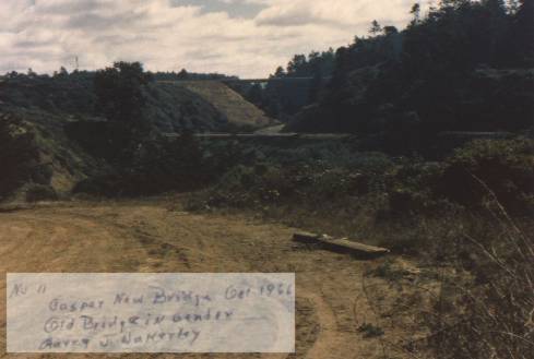 In 1966, the old curved highway bridge across the millpond on Caspar Creek was retired. Harry Wakerley, then caretaker of the Caspar Lumber Company land, took these pictures, the first dated 1966, the second, October 1966. Caspar needs to fill a 55 year gap in its history between 1940 and 1995. If you have photographs, please share them with us! At the Annual Meeting, 10 September 2000, we will be scanning old photographs and telling stories. Please come.