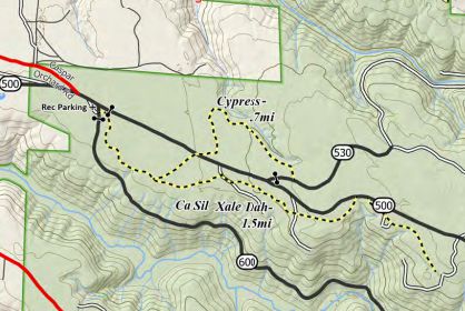 Trestle Trail: a rough new trail. Follow the Staircase trail from the Jughandle parking lot under the bridge, thence south (before the stairs) and gently contour up along the brink of Jughandle Creek canyon .97 miles one way to the railroad cut where the Jughandle Trestle stood until April 1906. |