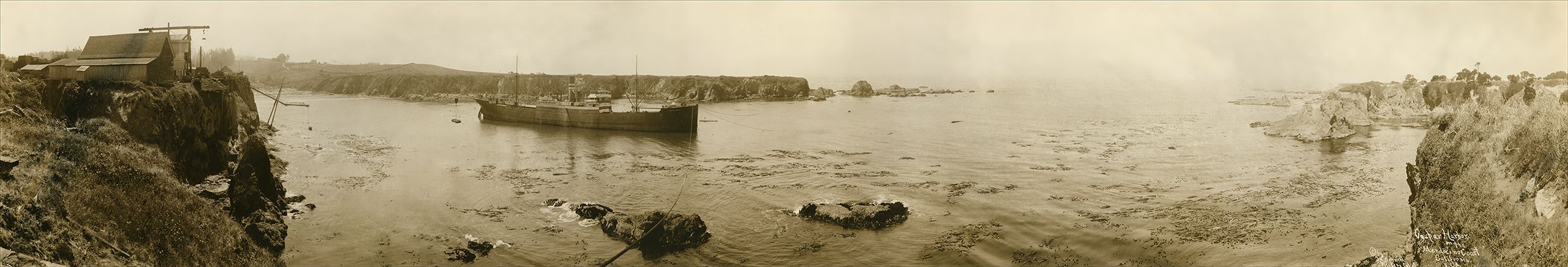 This image was made in 1911. The Steamship Earl of Forfar is moored in Caspar Anchorage and taking on a load of redwood lumber to be shipped to the United Kingdom. This is one of a set of three highly detailed panoramic photos, two of which were discovered by Matt Buchholz in the Library of Congress; Matt found the third – this image – at the Kelley House Museum in Mendocino. This is a small version of a much larger scan made, touched-up, and sepia-tinted by Braggadoon in Fort Bragg. Photo courtesy of Matt Buchholz.