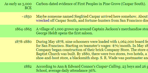 There's an apocryphal story that we once heard, about a reclusive man (whose name may or may not have been Caspar) who left civilization during California's over-busy Gold Rush period (1840—) and built himself a cabin on the flood plain beside Caspar lagoon. As you'll see in the Caspar Timeline, the town really got going in the mid-1860s under the impetus of a Captain Jackson. By 1880 there were two stores, two hotels, a livery stable, three saloons, a shoemaker and a blacksmith.